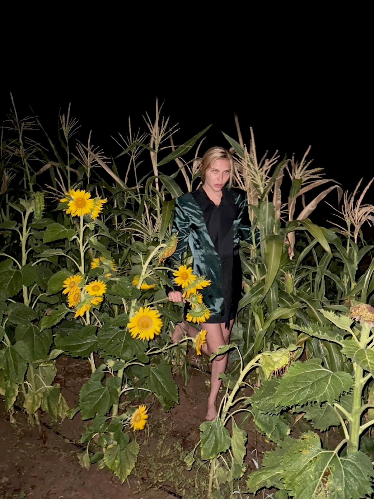 The Petit Grand Maxi Dress is one of his most iconic designs—exaggerated in silhouette yet precise in detail, balancing spectacle with discipline. On Lilia, it becomes more than a garment: it is armour and apparition, an emblem of defiance carried into the forest.