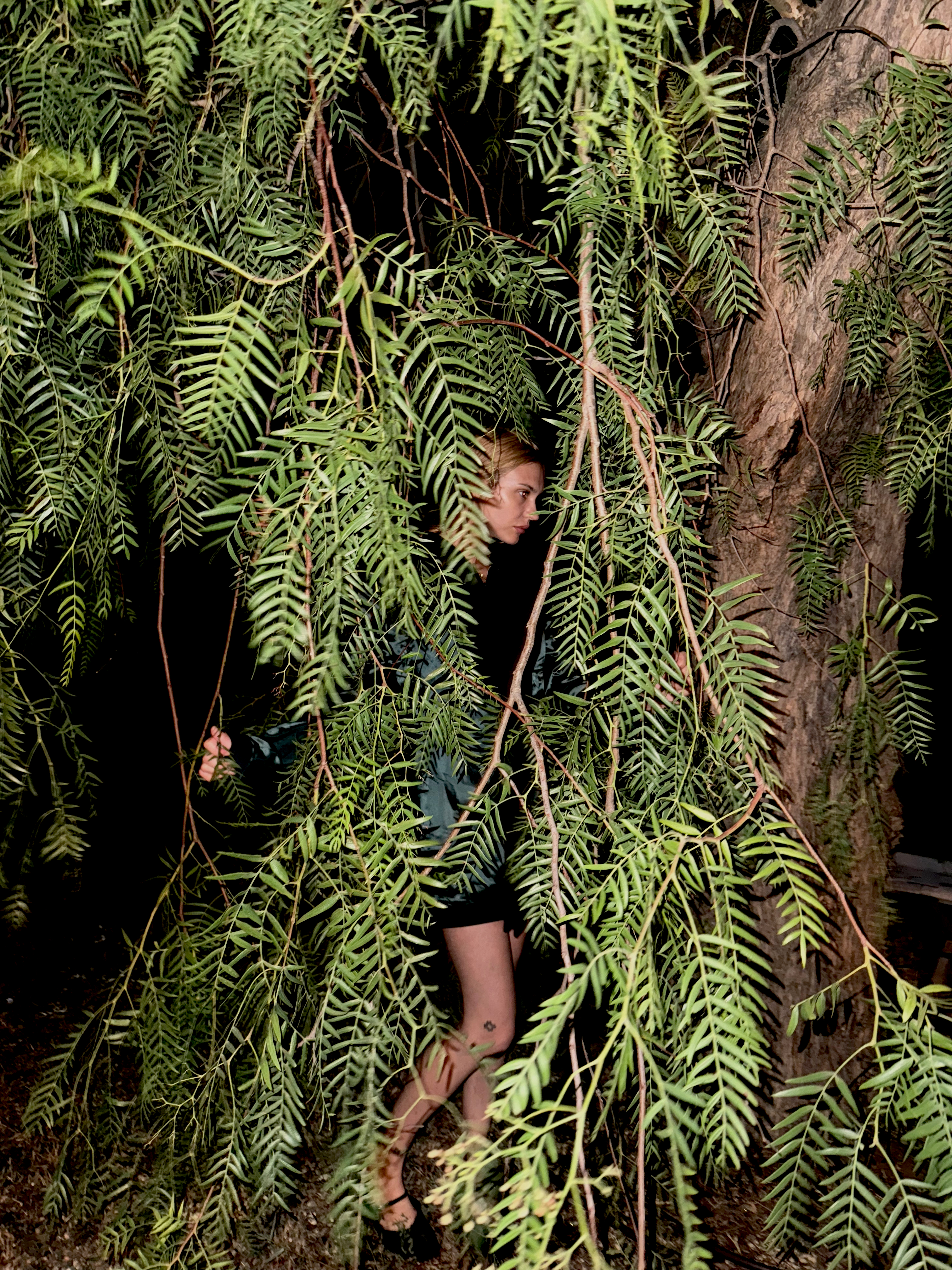 Against the backdrop of roots and shadow, the dress reads differently. Its volumes echo the swell of the landscape, its lines cut sharply against the quiet of the trees. Lilia’s presence heightens this contrast: her stance is uncompromising, her gestures measured yet electric. She turns Gaultier’s drama into something ritualistic, a performance stripped of stage lights and reframed in the hush of woodland dusk.