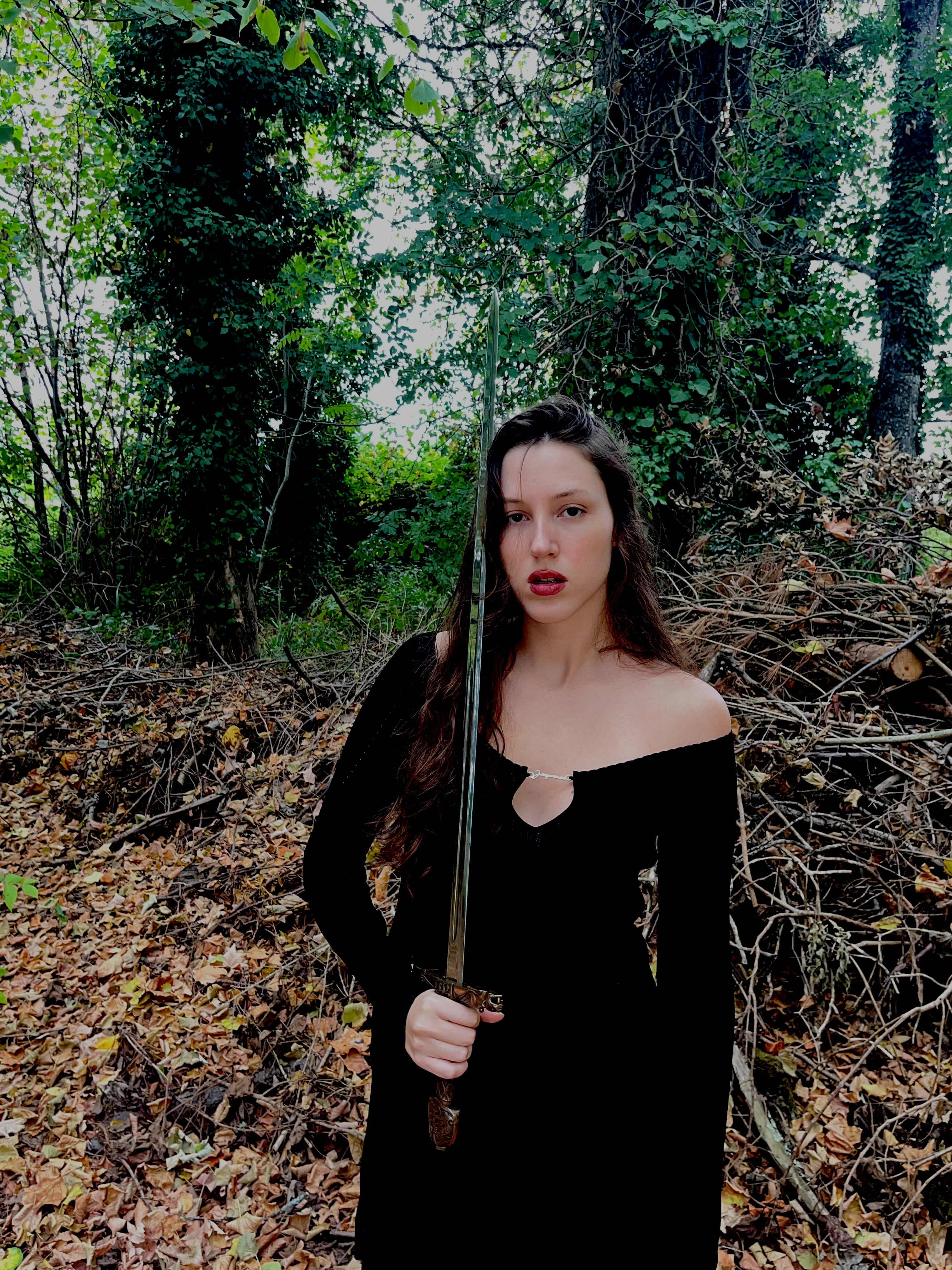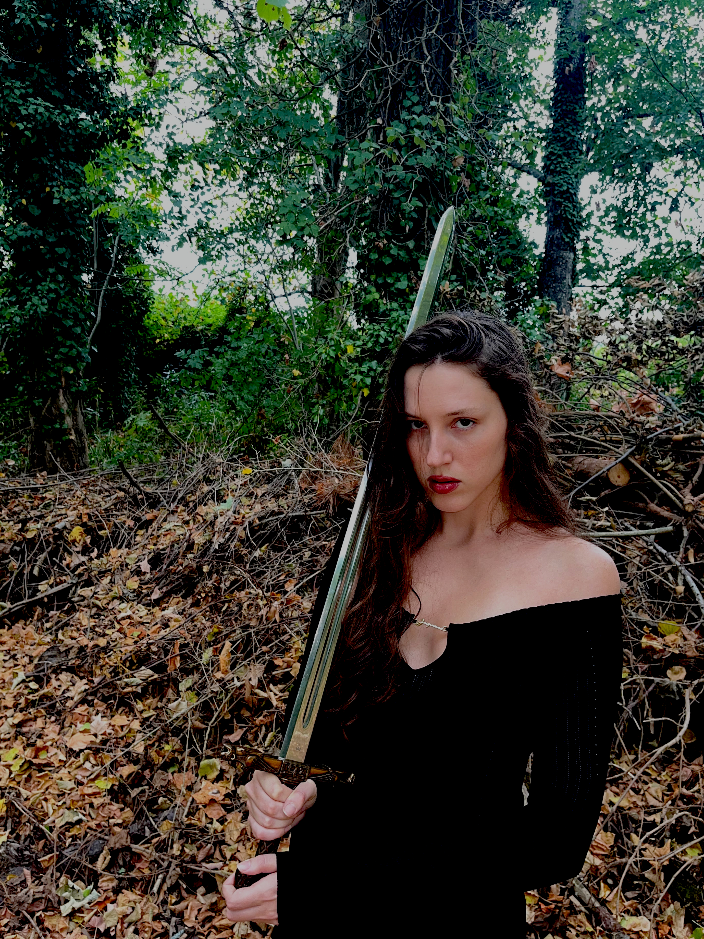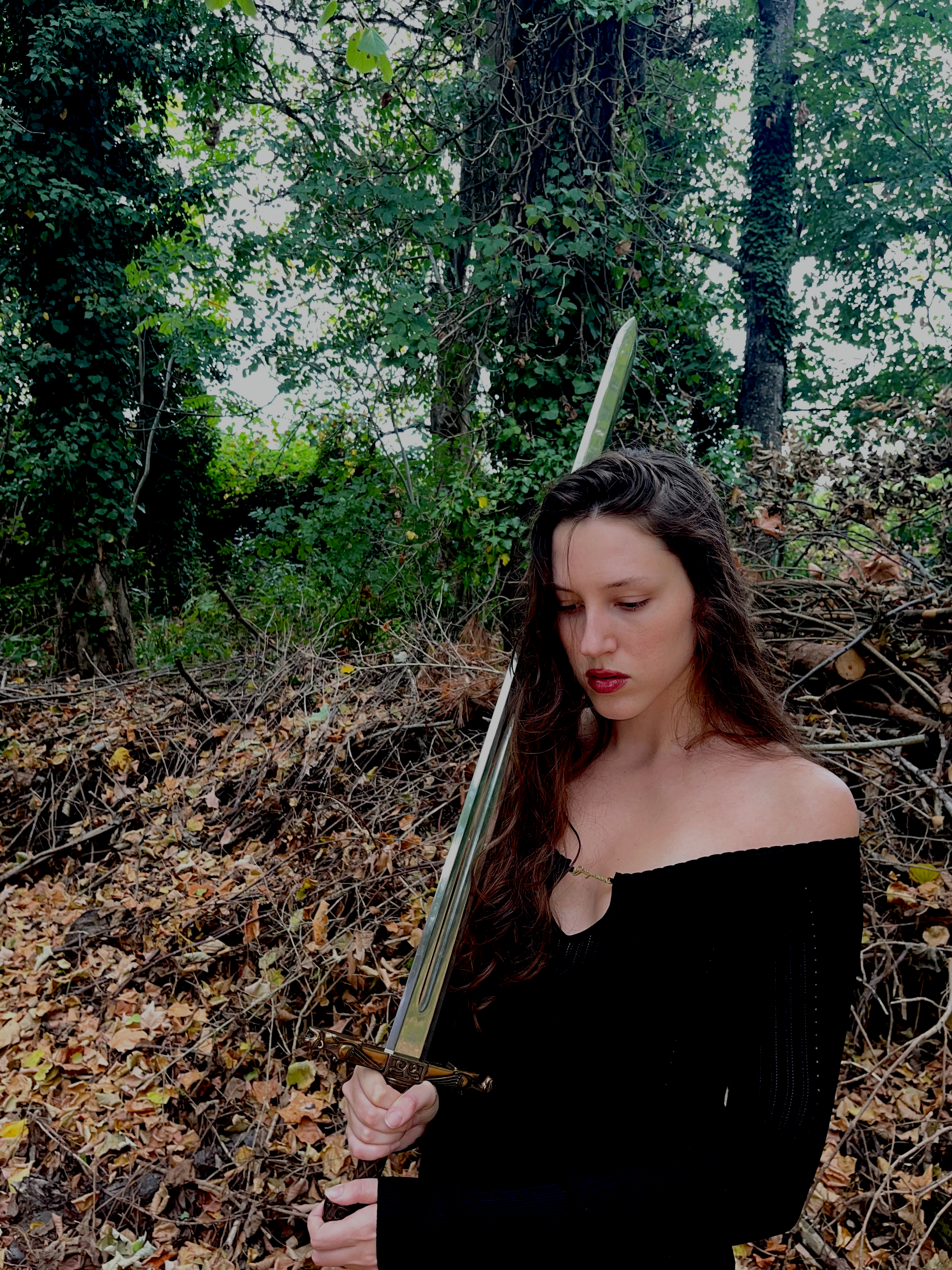In her hands, even a sword ceases to be theatrical accessory and becomes extension—an emblem of defiance that sets her apart in the woodland silence.