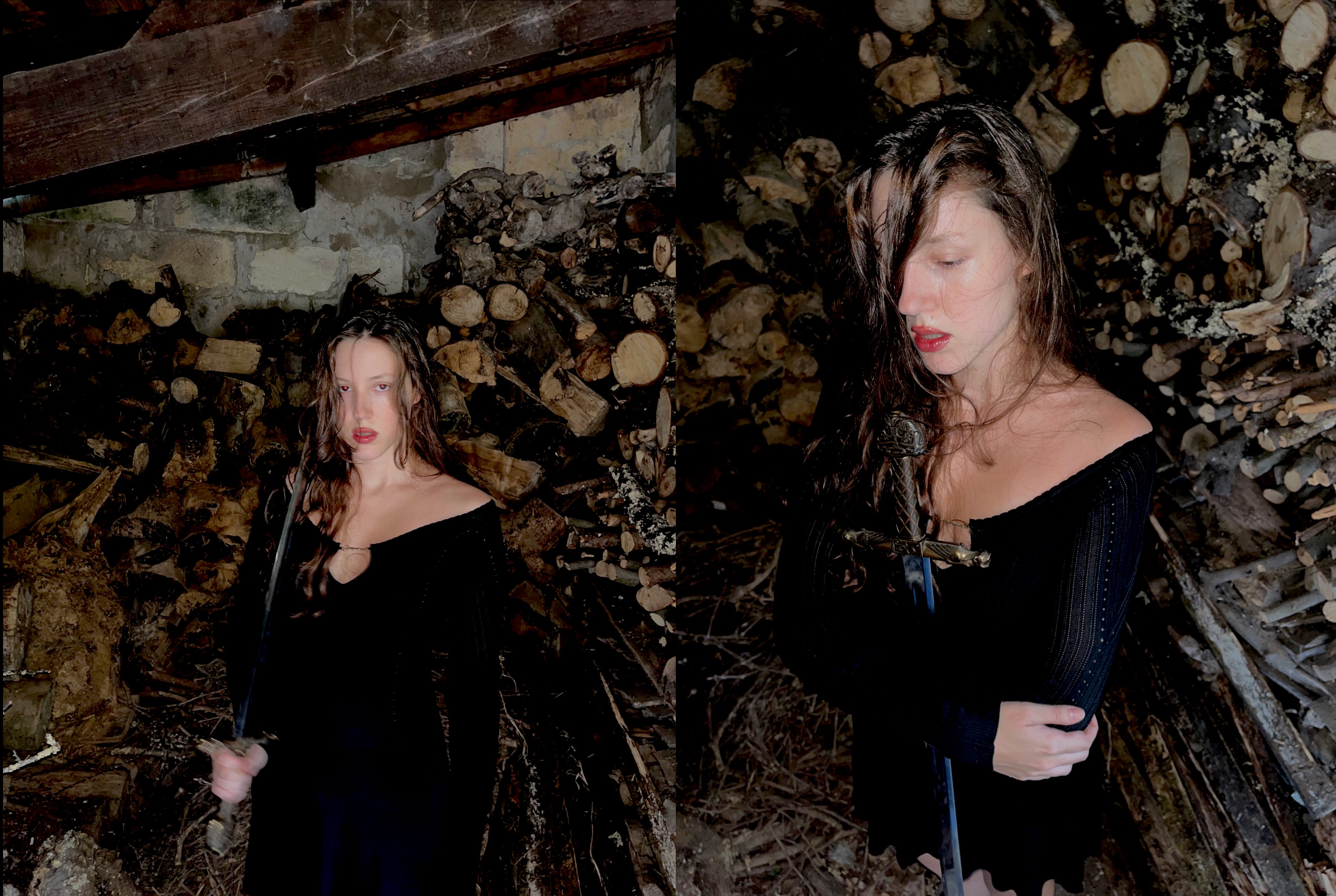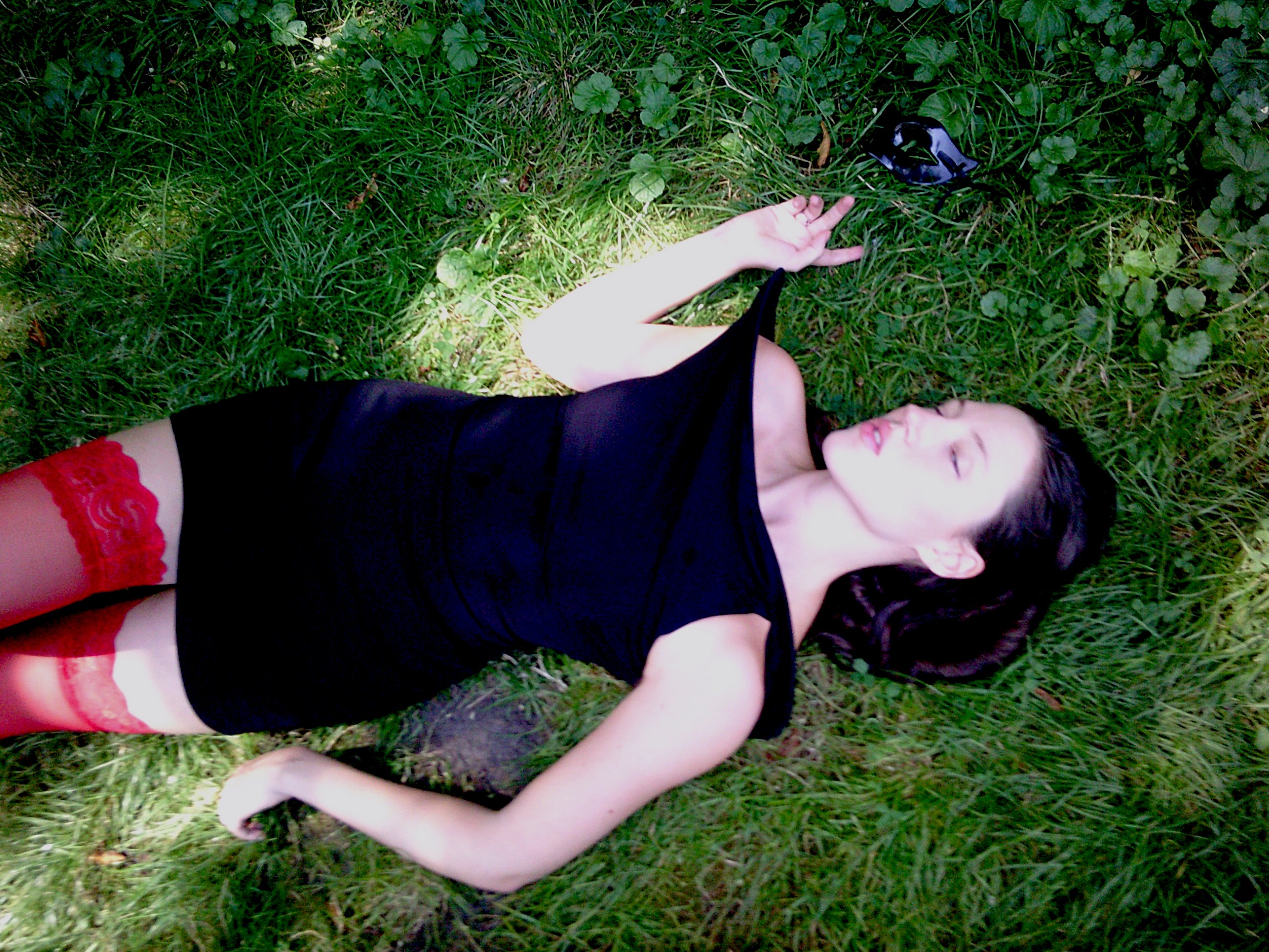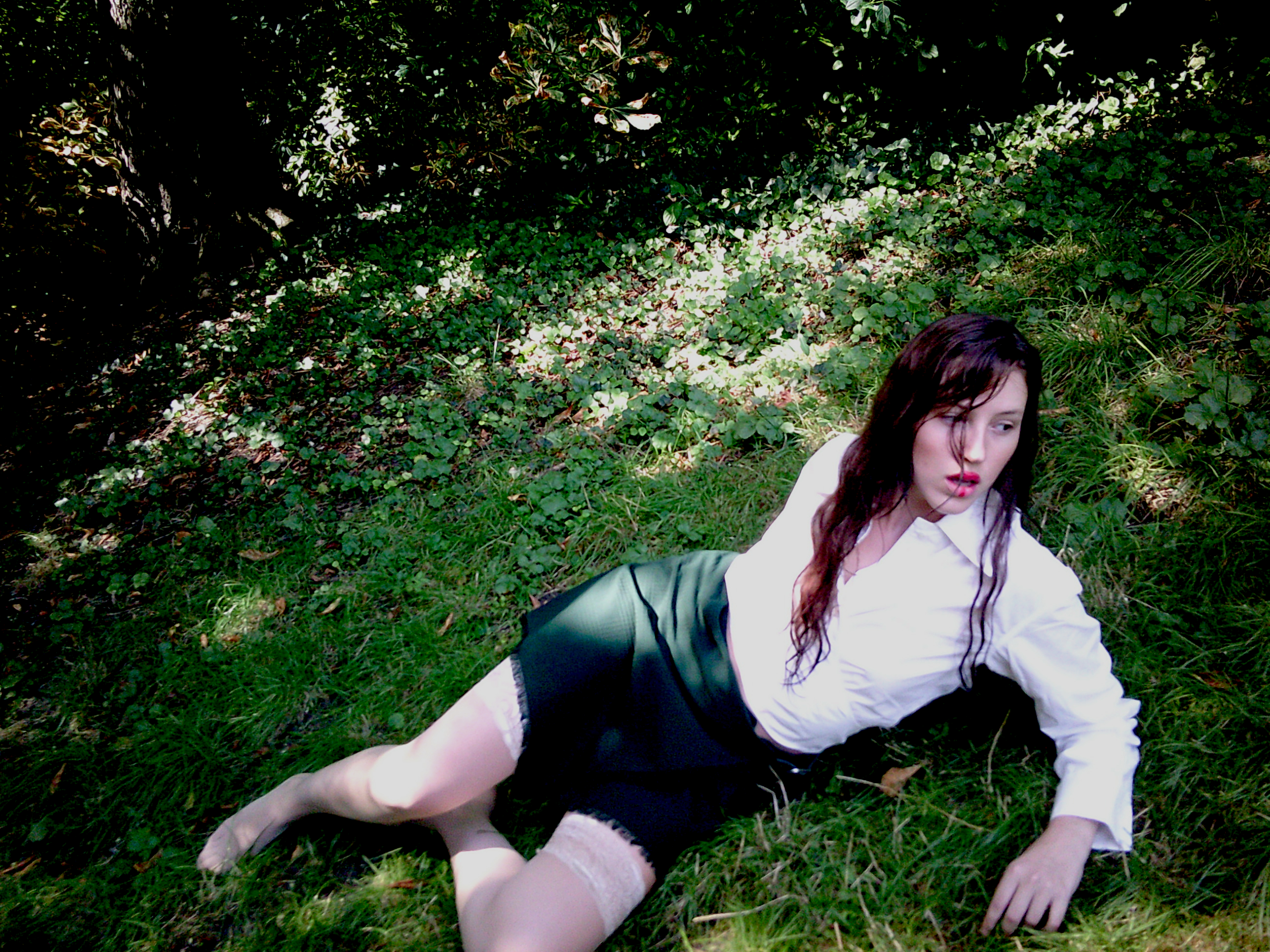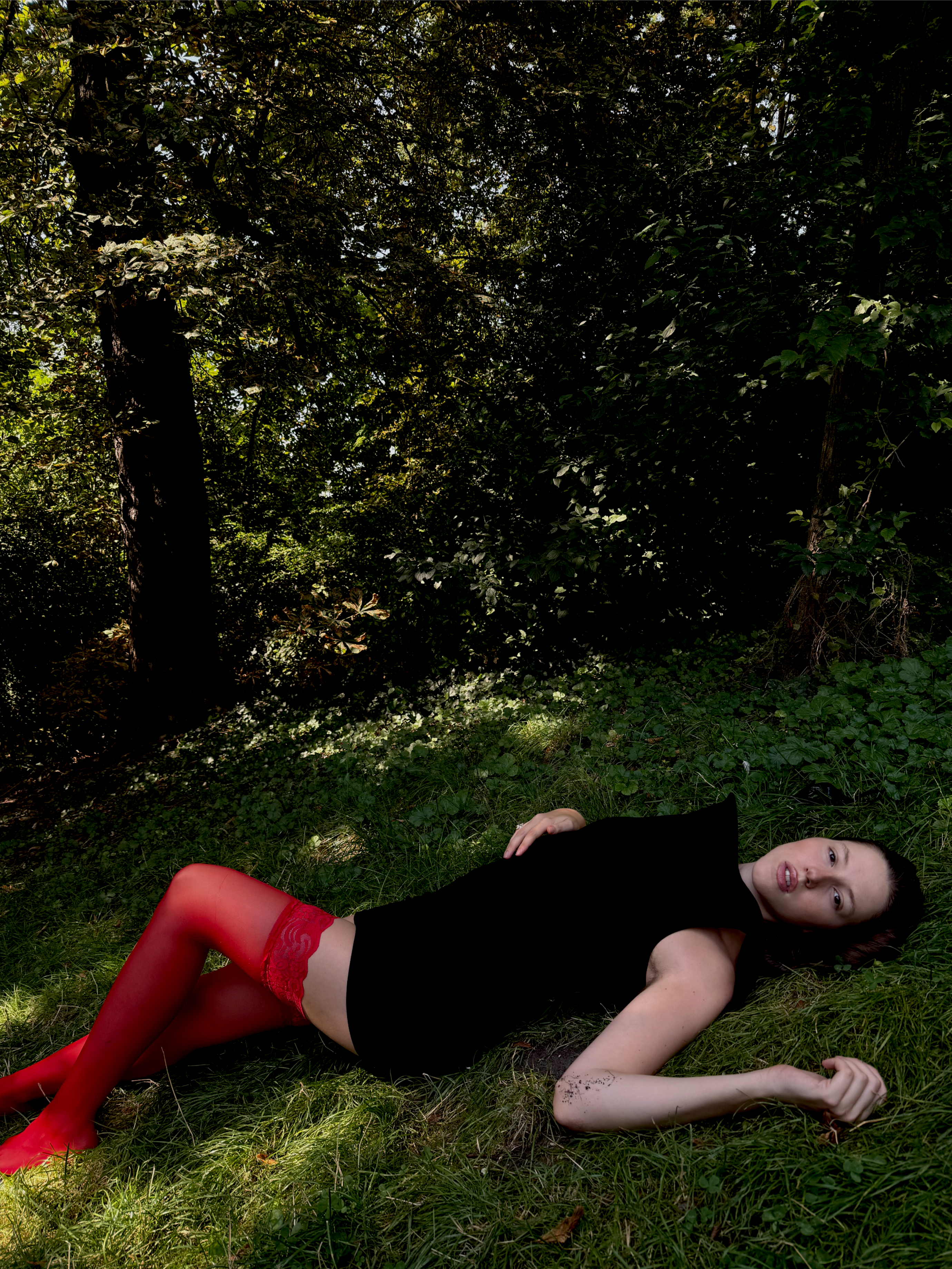 The crimson of her stockings slashes violently through the green, an unexpected cut of colour against the hush of the forest. The little black dress catches fragments of light like a blade, turning softness into edge, intimacy into confrontation.